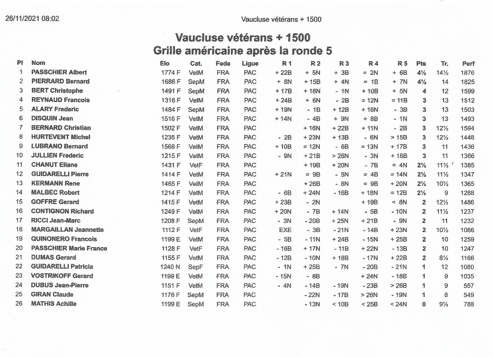 Le championnat de Vaucluse des Vétérans et Séniors Plus 2021 s'est terminé jeudi 25 novembre à Morières, après 5 rondes réparties sur plus d'un mois de compétition. Les 4 joueurs du club de Caumont se sont illustrés parmi les 26 participants. Jugez plutôt...